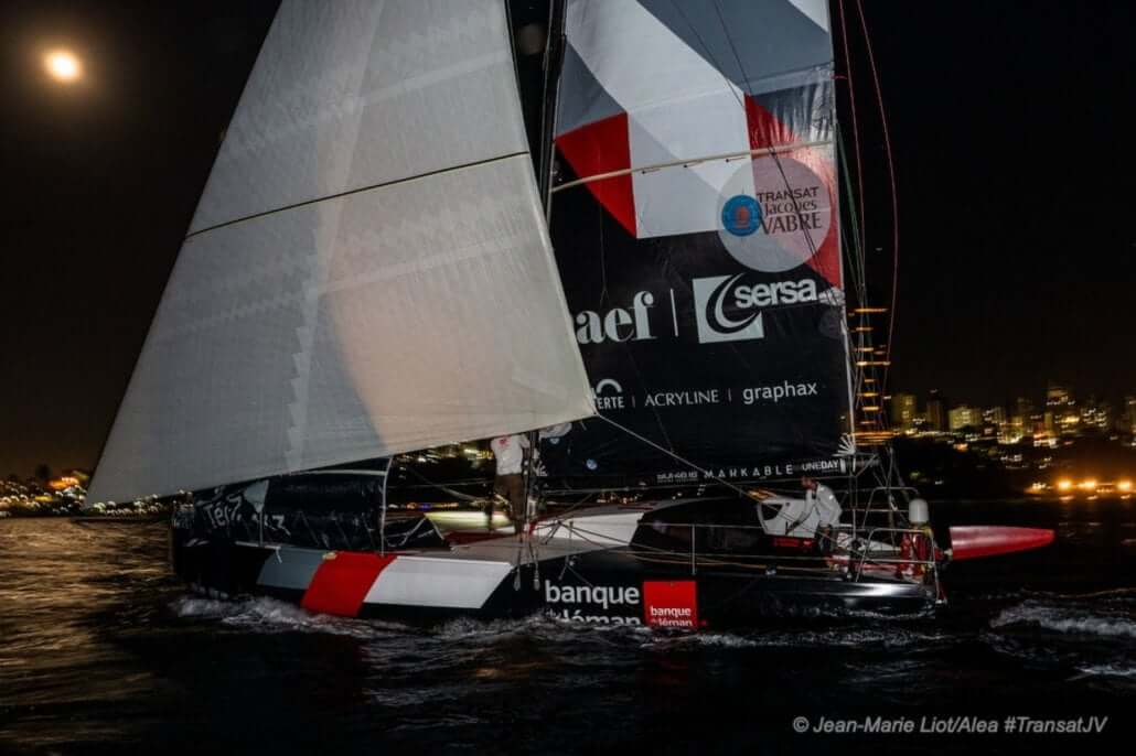 The skipper of the Banque du Léman covered the 3,542-mile course between Saint-Malo and Pointe-à-Pitre at a speed of 9.98 knots. The great circle (the direct route). In fact, he covered 4,015.19 miles at an average speed of 11.32 knots.